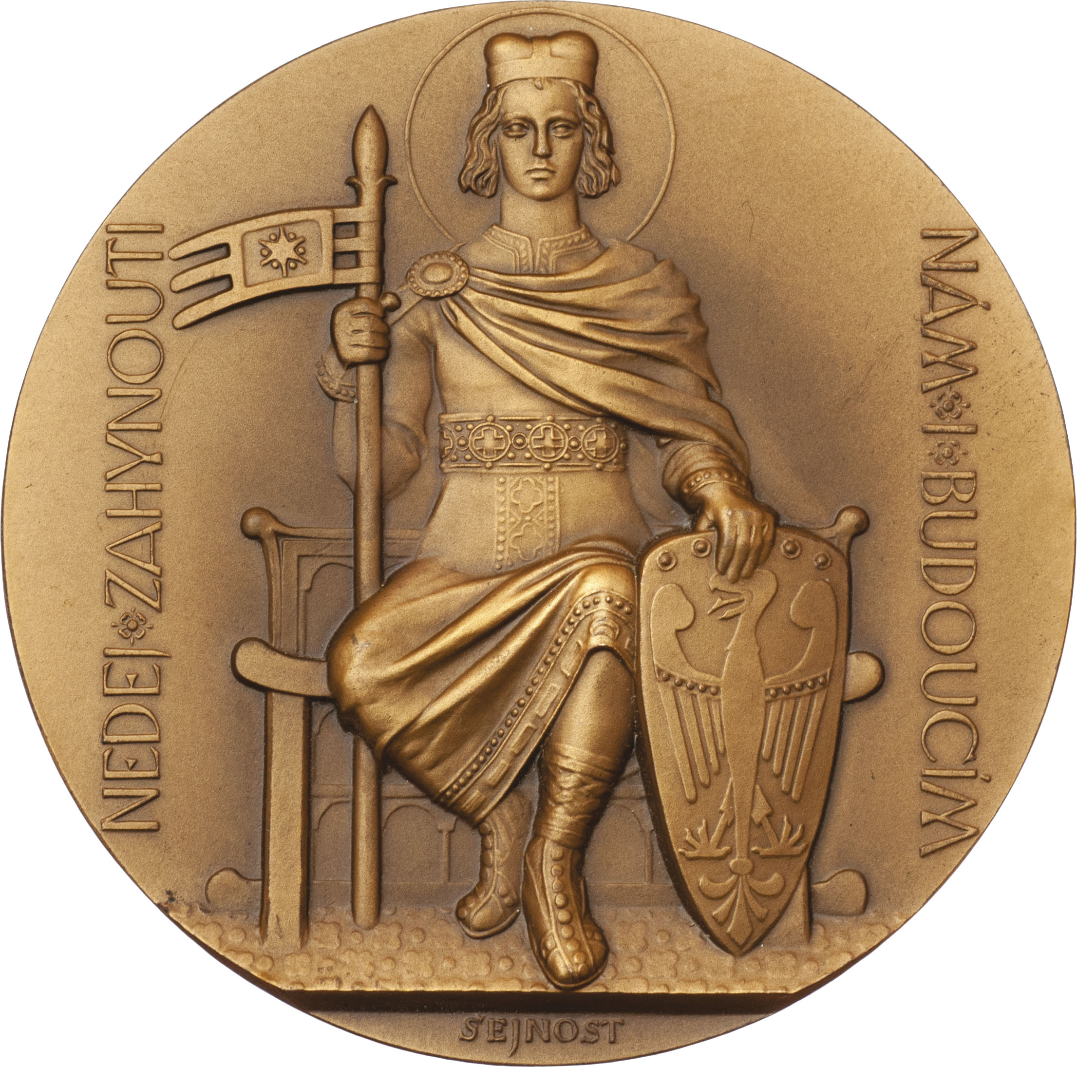 AE Medaile na dokončení velechrámu svatého Víta 1929 - sv.Václav čelně, nápis / budova katedrály, zemské znaky, nápis a opis, Sign., bronz 70 mm, patina