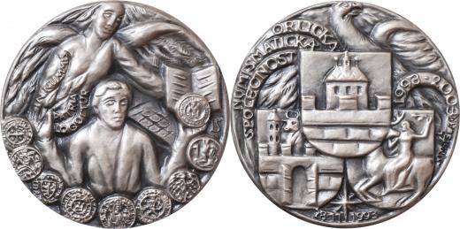 Orlická numismatická společnost 2003 - znaky tří měst, orlice a nápis na stuze/ anděl a muž s mincemi, písmo, Sign., Ag925, 60mm, 180.481g, čísl.7/10 RRR!