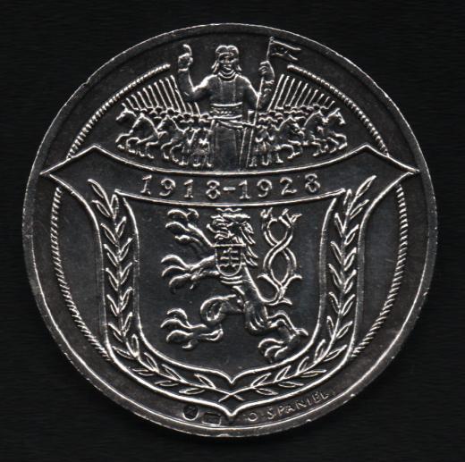 Jsem ražen z českého kovu - 10.výročí republiky 1928 - sv.Prokop orá s čertem, havíř, opis / svatý Václav s rytíři, znak, Sign., Ag987, 34mm, 19.995g, nep.rys.