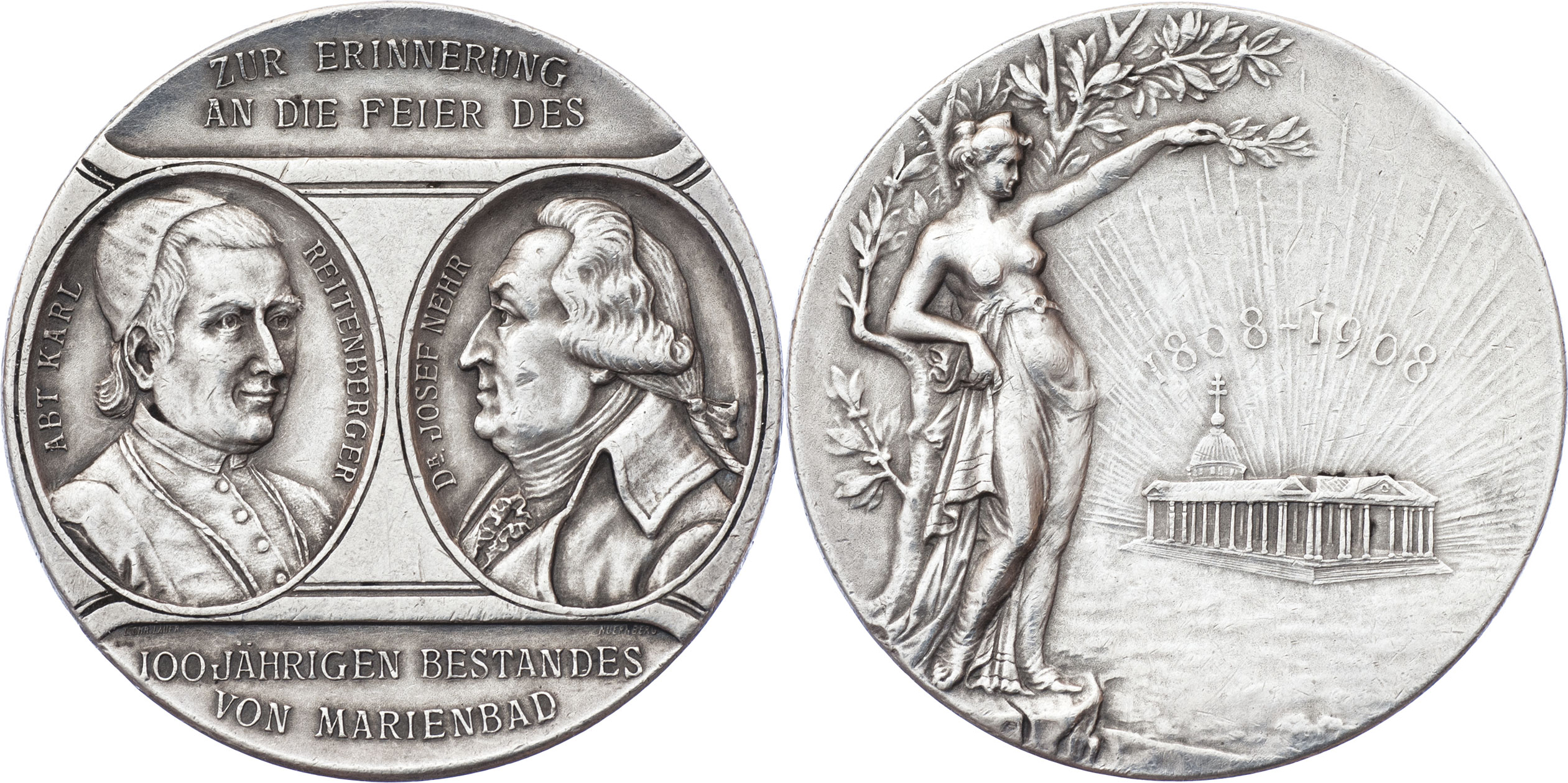 Neuberger - AR medaile na 100 let založení lázní 1908 - medailonky s portréty zakladatelů, nápis / postava, pavilon a vročení, Nesign., 40mm, 25.070g, dr.rysky