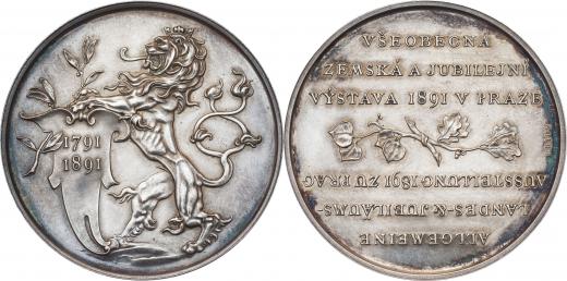 Braun - AR medaile pro vystavovatele - český lev s praporcem / lipová a dubová ratolest, česko-německý nápis, Punc., Ag 44mm, 38.365g, ŠFP.17b, krásná pat.