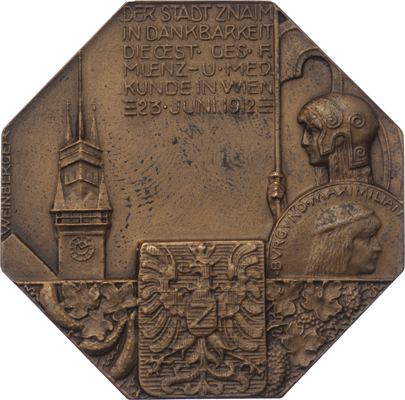 Rakouská spol. přátel mincí a medailí děkuje Znojmu 1912 - znak města, věž, Aténa se štítem a praporcem, a nápis, Sign.Weinberger, patinov. bronz 45x45 mm R!