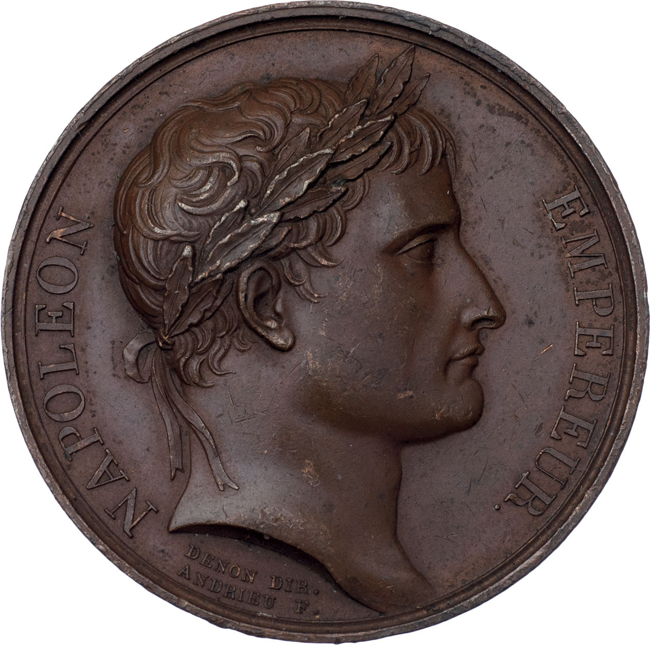 Andrieu a Jeufferoy - korunov.medaile An.13 (1804) - poprsí zprava / císař na štítu neseném senátorem a vojákem, opis, Sign., měď 40 mm, Zeitz.38, dr.rysky
