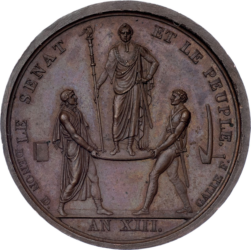 Droz a Galle - korunovační medaile An.13 (1804) - poprsí zleva / císař na štítu neseném senátorem a vojákem, opis, Sign., měď 26 mm, Zeitz.40, patina