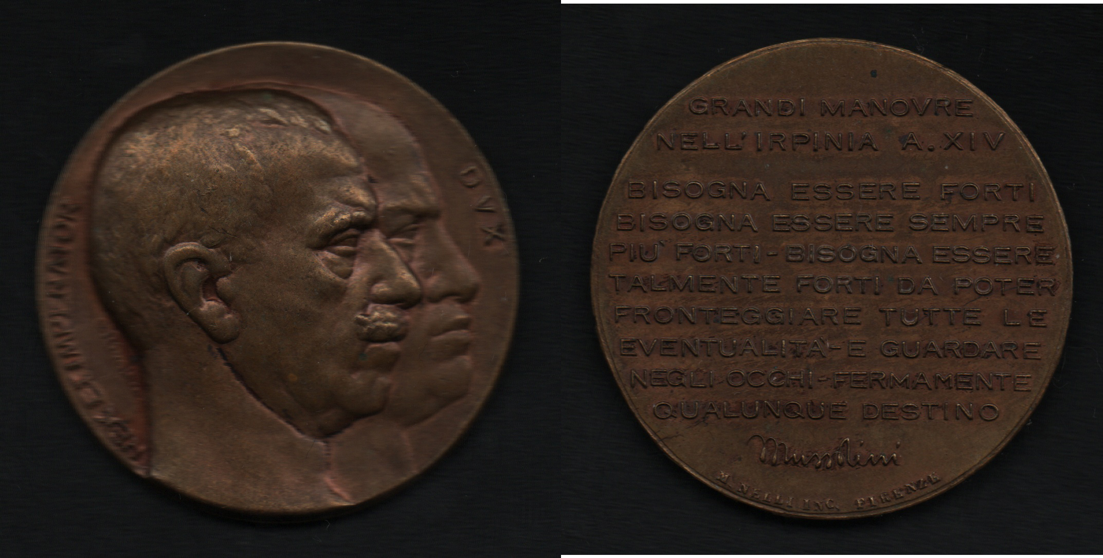 Vittorio Emanuele III., Mussolini - medaile na velké manévry roku XIV (1936) - dvojportrét zprava, opis / 12-řádk.nápis, Sign.Rivalta/Nelli, bronz 40 mm, téměř