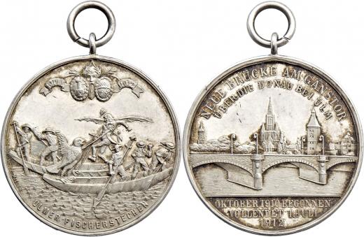 Miller - AR medaile na otevření nového mostu 1912 - most, město a nápis / znaky, souboj člunů na řece, nápis, Ag950, 15.126g, 32 mm, pův.ouško, dr.rys., tém