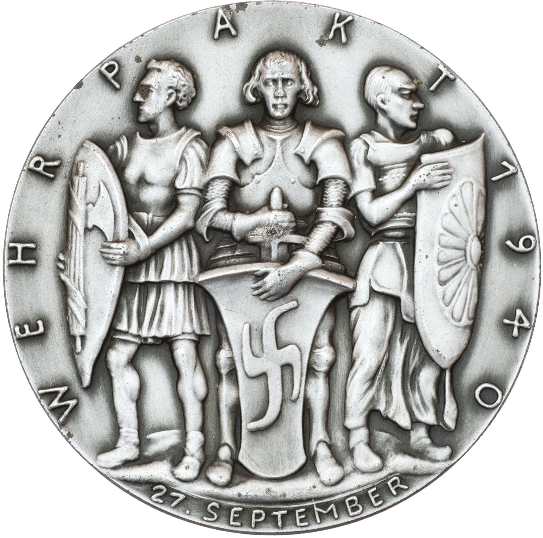K.Goetz - vznik paktu Berlin-Řím-Tokio 27.9.1940 - legionář, rytíř a samuraj, opis / orlice s váhami na zeměkouli, opis, Sign., patinovaný zinek 60 mm RR!