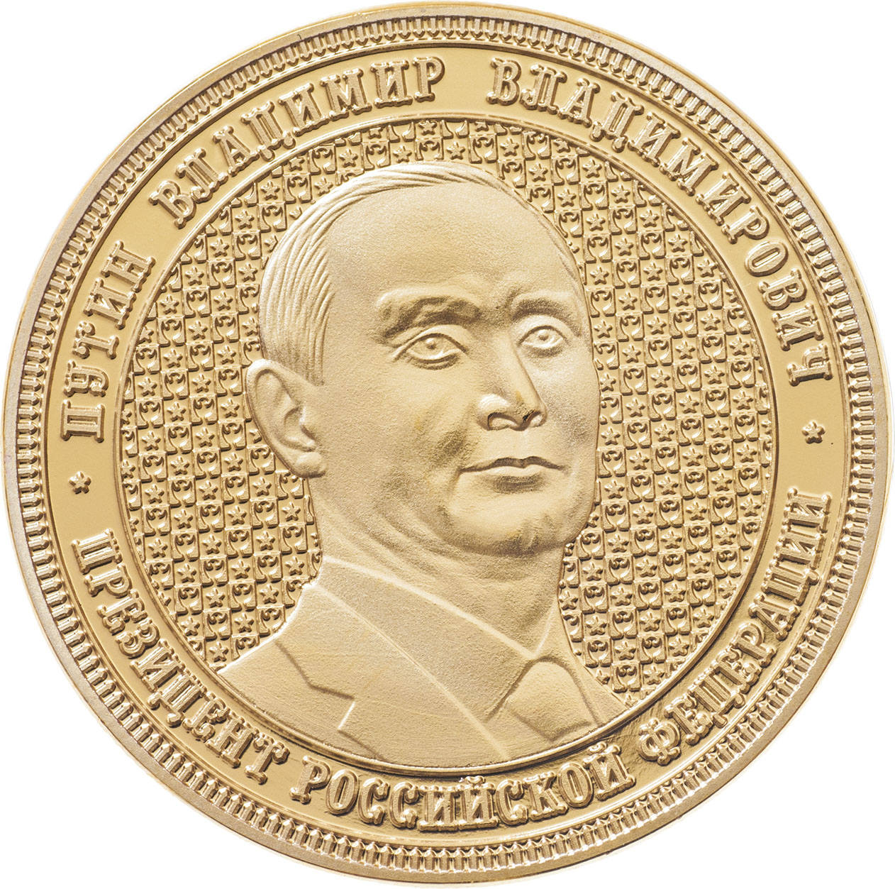 Připojení Krymu k Ruské federaci 2014 - portrét Vladimíra Vl. Putina, opis / mapa Krymu a znak RF na globu, Nesign., pozlacená mosaz 38 mm, kapsle