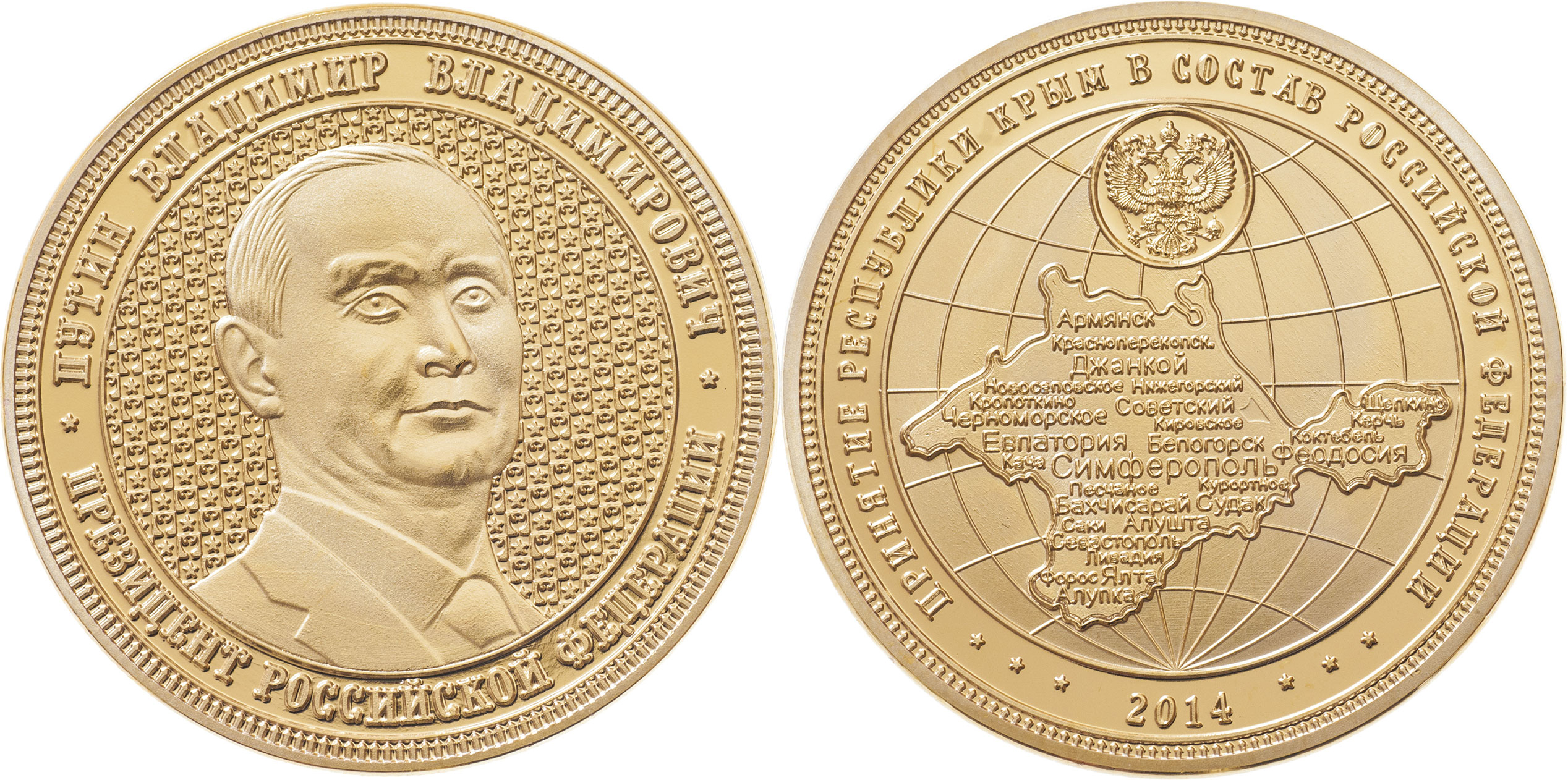 Připojení Krymu k Ruské federaci 2014 - portrét Vladimíra Vl. Putina, opis / mapa Krymu a znak RF na globu, Nesign., pozlacená mosaz 38 mm, kapsle