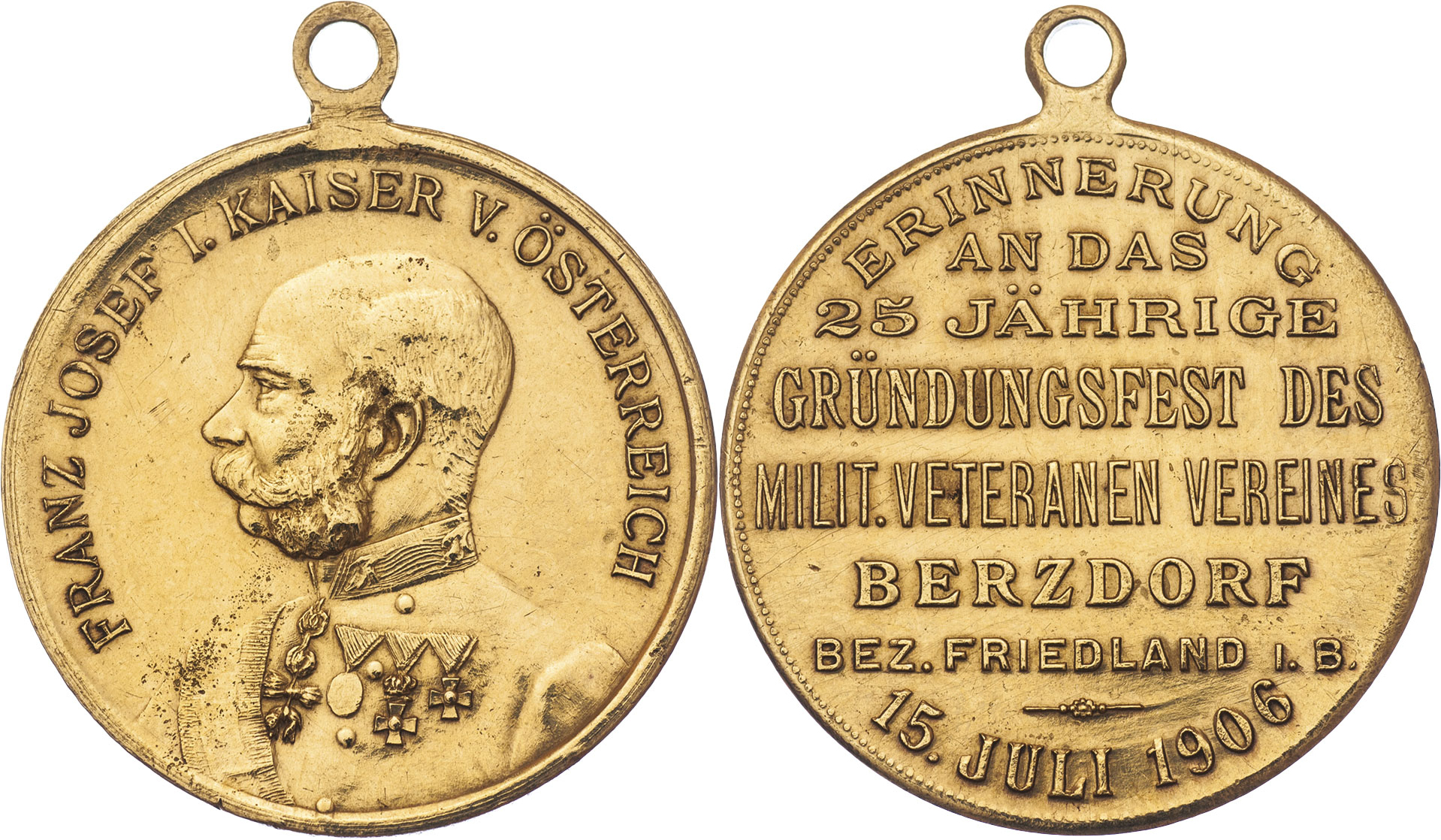 Berzdorf (Suchá, dnes Ostašov u Liberce) 1906 - 25 let trvání 15.7., Nesign., mosaz 30 mm s původním raž. ouškem, Indra.neuvádí, nep.hr., nep.rysky, téměř