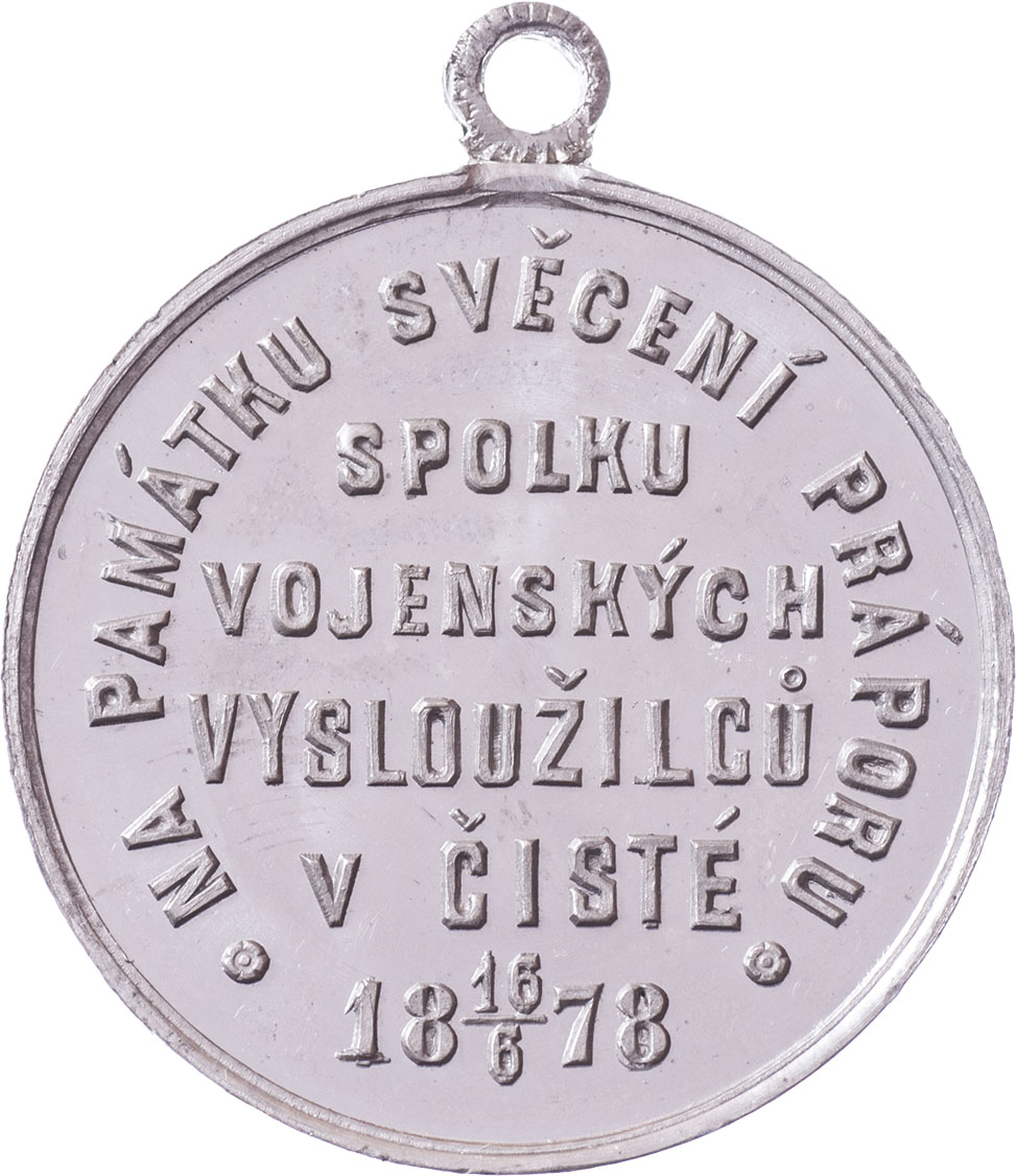 Čistá 1878 - svěcení praporu 16.6., Nesign., cín 30 mm s původním raženým ouškem, Indra.str.38