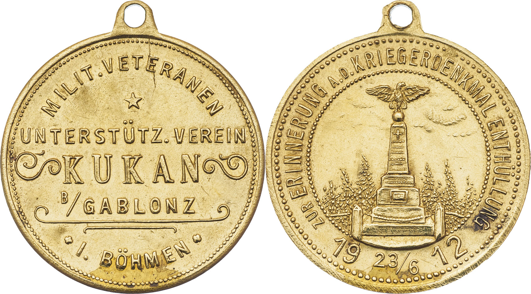Kukan (Kukonín u Jablonce) 1912 - odhalení válečného pomníku 23.6., Nesign., zlacený bronz 28 mm s původ. raženým ouškem, Indra.str.41