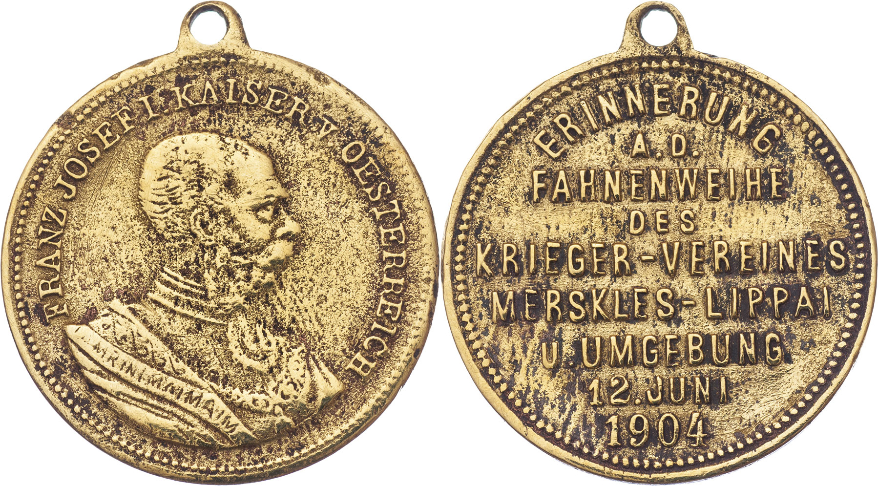 Merskles-Lippai (Mrsklesy u Litoměřic) 1904 - svěcení praporu 12.6., Nesign., mosaz 28 mm s původ. raženým ouškem, jako Indra.neuvádí, hr., rysky, koroze