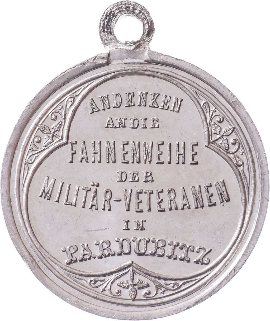 Pardubice 1879 - svěcení praporu 7.9., Nesign., cín 32 mm s původním raženým ouškem, Indra.str.46, dr.hr.