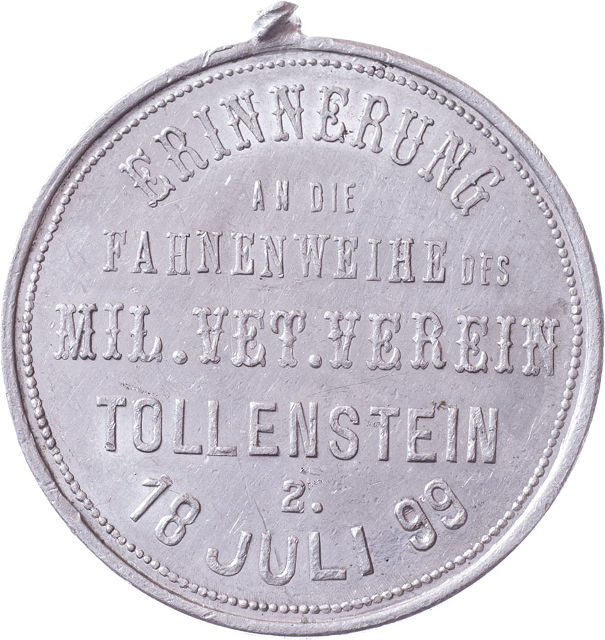 Tollenstein (Rozhled u Děčína) 1899 - svěcení praporu 18.7., Nesign., hliník 28 mm, původní ouško odlomeno, Indra.str.48(mosaz), nep.rysky