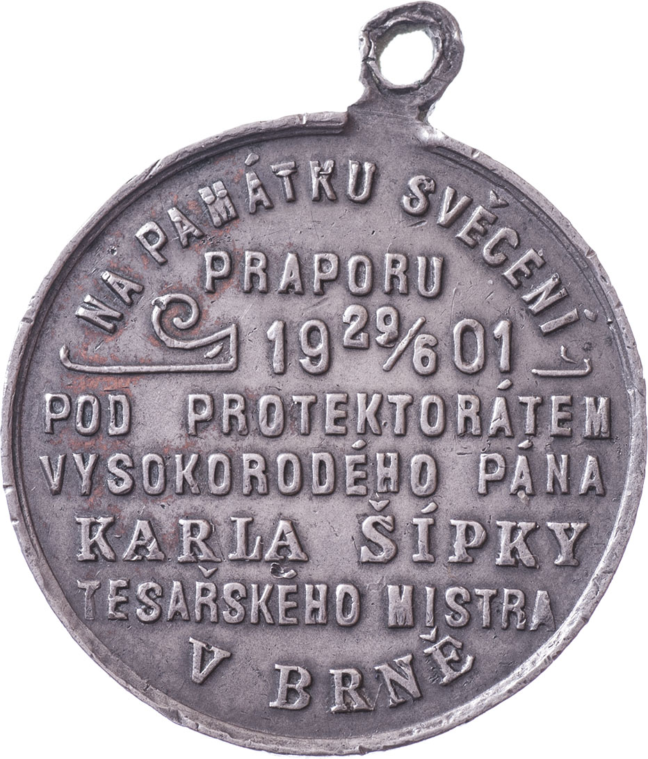 Žebětín 1901 - protektor tesařský mistr Karel Šipka - svěcení praporu 29.6., Nesign. cín 29 mm s původním raženým ouškem, Indra.str.51, hr., dr.rysky