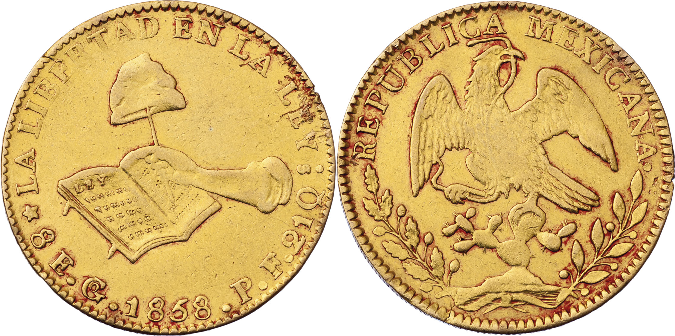 8 Escudos 1858 Go-PF, Guanajuato, KM.383.7, 26.780g, dr.hr., dr.rysky, patina R!
