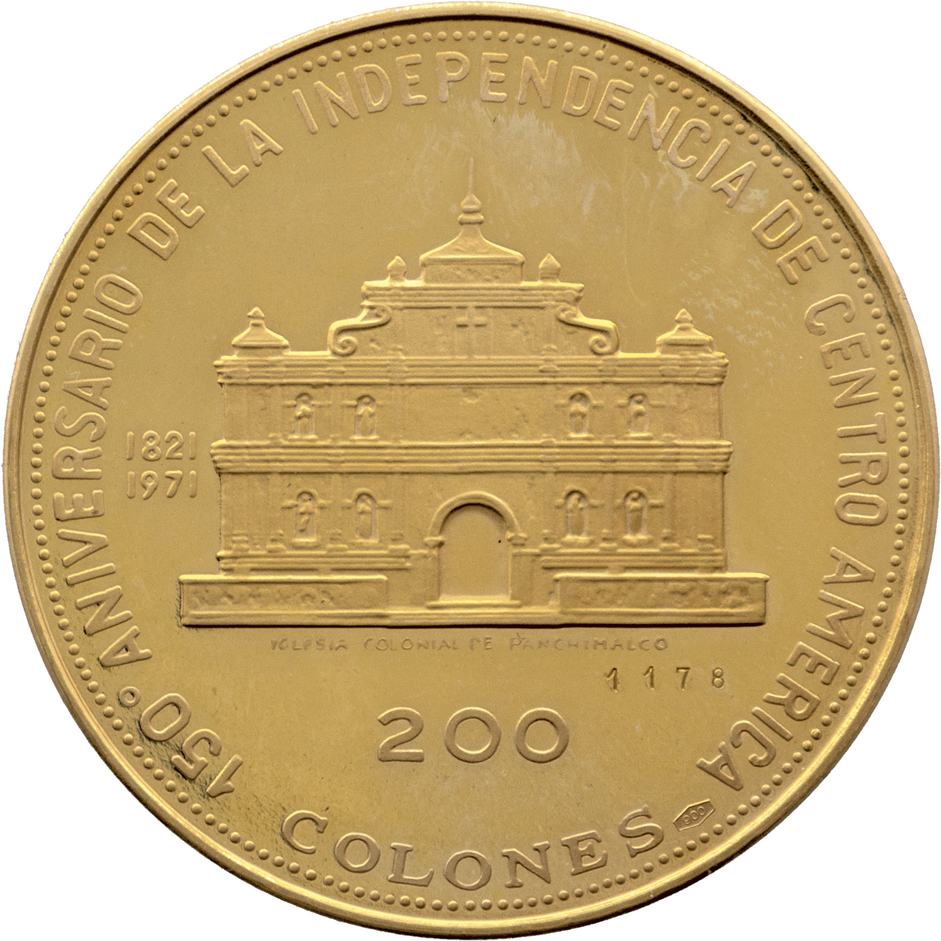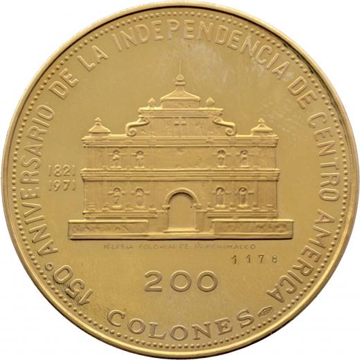 200 Colones 1971 - 150 let nezávislosti - chrám v Panchimalcu, KM.146 (pouze 2.246 ks), 23.590g, v reversu číslováno "1178", patina