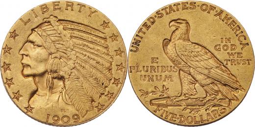 5 Dolar 1909 D - hlava indiána, KM.129, 8.337g, nep.hr., nep.rysky, patina
