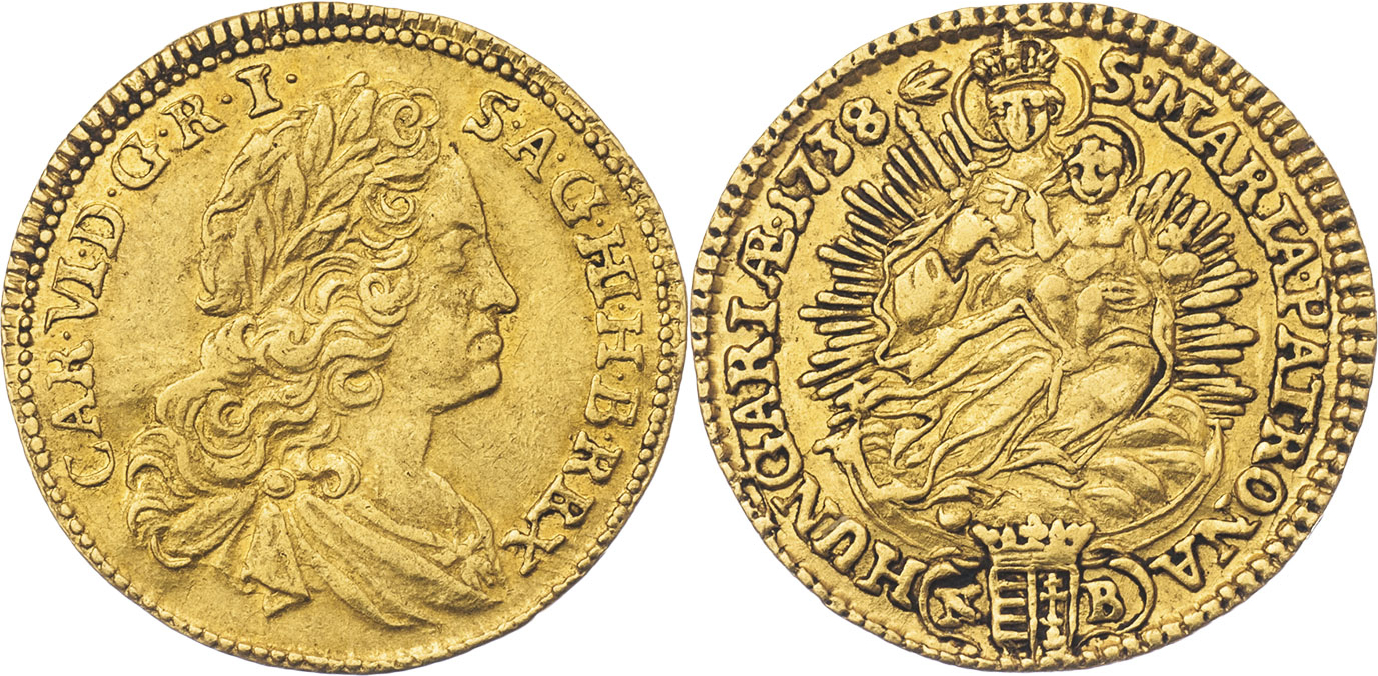 Dukát 1738 NB, Nagy-Banya, Husz.1593, 3.446g, nep.zvlněný, nep.just., nep.rysky, patina R!