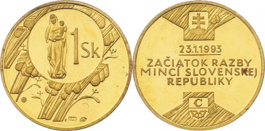 Začátek ražby mincí Slovenské republiky 23.1.1993 - motiv jednokoruny, lipové lístky / styliz. razidla, znaky a nápis, Nesign., Punc., Au986, 23mm, 10.784g