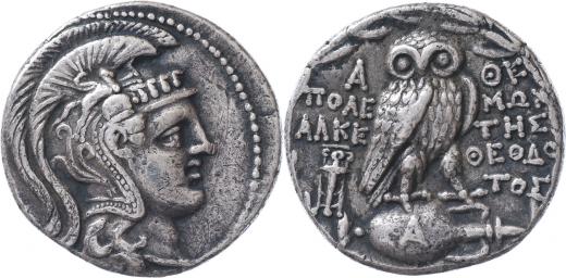 AR Tetradrachma, Hlava Atény v přilbě doprava / sova sedící na amfóře, jména mincmistrů, vpravo dole trojnožka, podobná jako SG.2555, 16.656g, patina