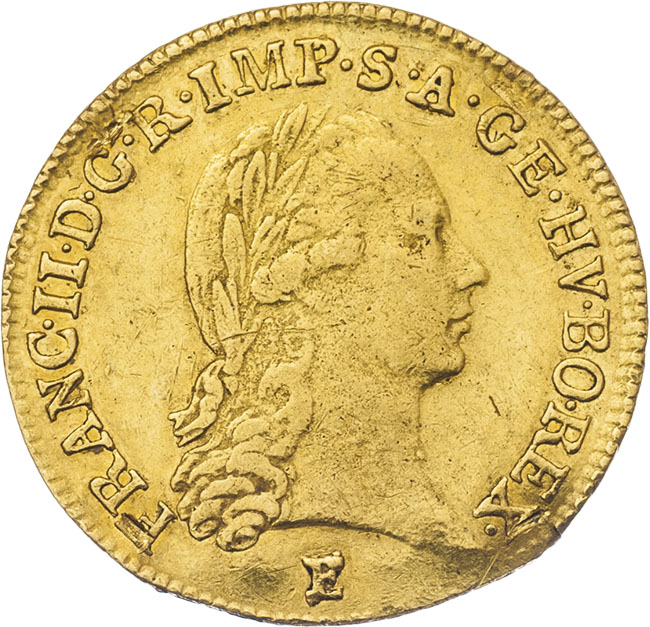 Dukát 1794 E, Karlovský Bělehrad, 3.415g, zvlněný okraj, dr.hr., dr.rysky, patina R!