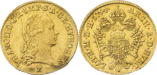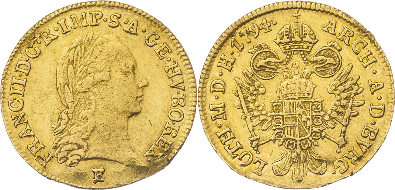 Dukát 1794 E, Karlovský Bělehrad, 3.415g, zvlněný okraj, dr.hr., dr.rysky, patina R!