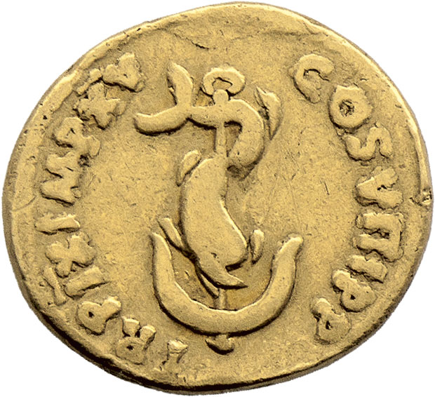 Aureus, Rv:"TR.P.IX.IMP.XV.COS.VIII.P.P.", delfín obtočený kolem kotvy, S.neuvádí, RIC.26a - mincovna Řím - ražba z roku 80, 7.030g, mírně kor., škr. R!