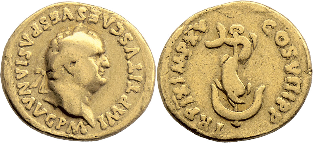 Aureus, Rv:"TR.P.IX.IMP.XV.COS.VIII.P.P.", delfín obtočený kolem kotvy, S.neuvádí, RIC.26a - mincovna Řím - ražba z roku 80, 7.030g, mírně kor., škr. R!