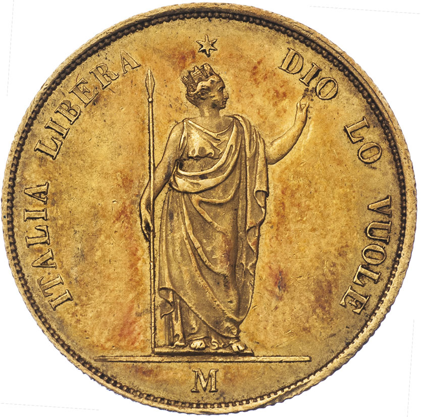 40 Lira 1848 M - stojící Italie, italský opis/3-řádk. nápis ve věnci a opis, Cr.24 (raženo pouze 5875 ks), 12.893g, nep.hr., nep.rysky, patina, téměř RR!