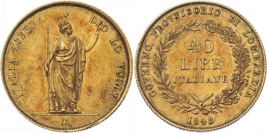 40 Lira 1848 M - stojící Italie, italský opis/3-řádk. nápis ve věnci a opis, Cr.24 (raženo pouze 5875 ks), 12.893g, nep.hr., nep.rysky, patina, téměř RR!