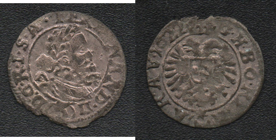 3 Krejcar 1622, Praha-Hübmer, J.1b, MKČ.709, 0.762g, krajový stř., nep.nedor., pěkná patina