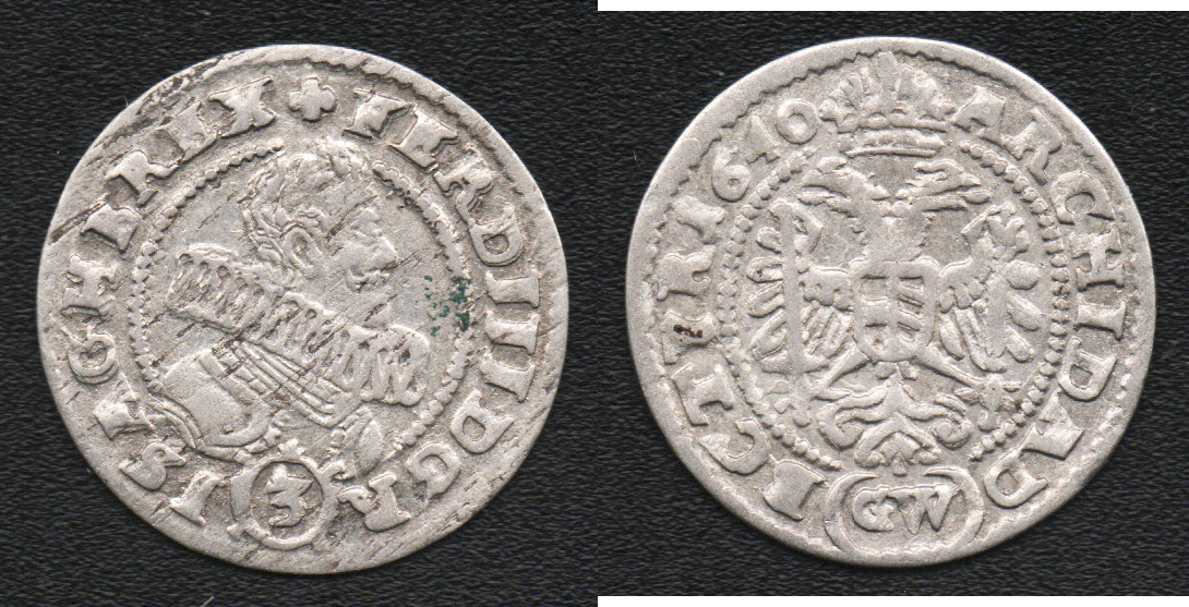 3 Krejcar 1640 GW, Georg Werner, NŠ.155, MKČ.1337a, 1.666g, dr.vady mater., nep.nedor., skvrnky, patina, téměř