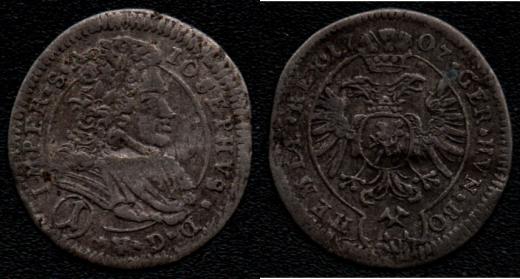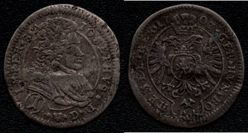 Krejcar 1707, K.Hora-Wohnsiedler, J.2a, MKČ.1732a (kopce ve značce mincm., poprsí nedělí opis), 0.817g, mírně zvlněný, nep.nedor., skvrnka, patina