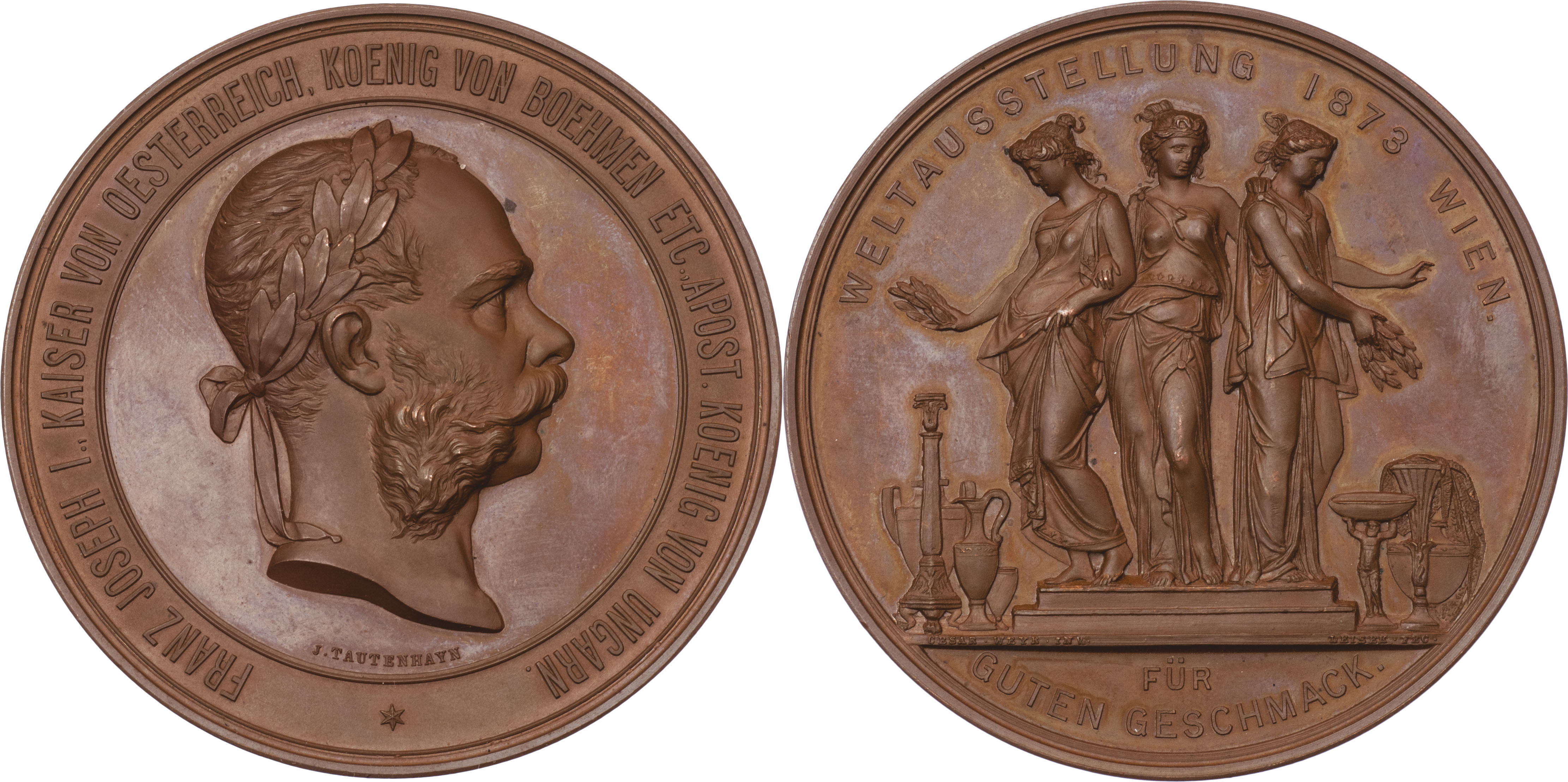 Tautenhayn - svět. výstava 1873 - FÜR GÜTEN GESCHMACK - portrét zprava, něm. opis / tři alegorické postavy, nápis, Sign., měď 70mm, 146.747g, Haus.2919, patina