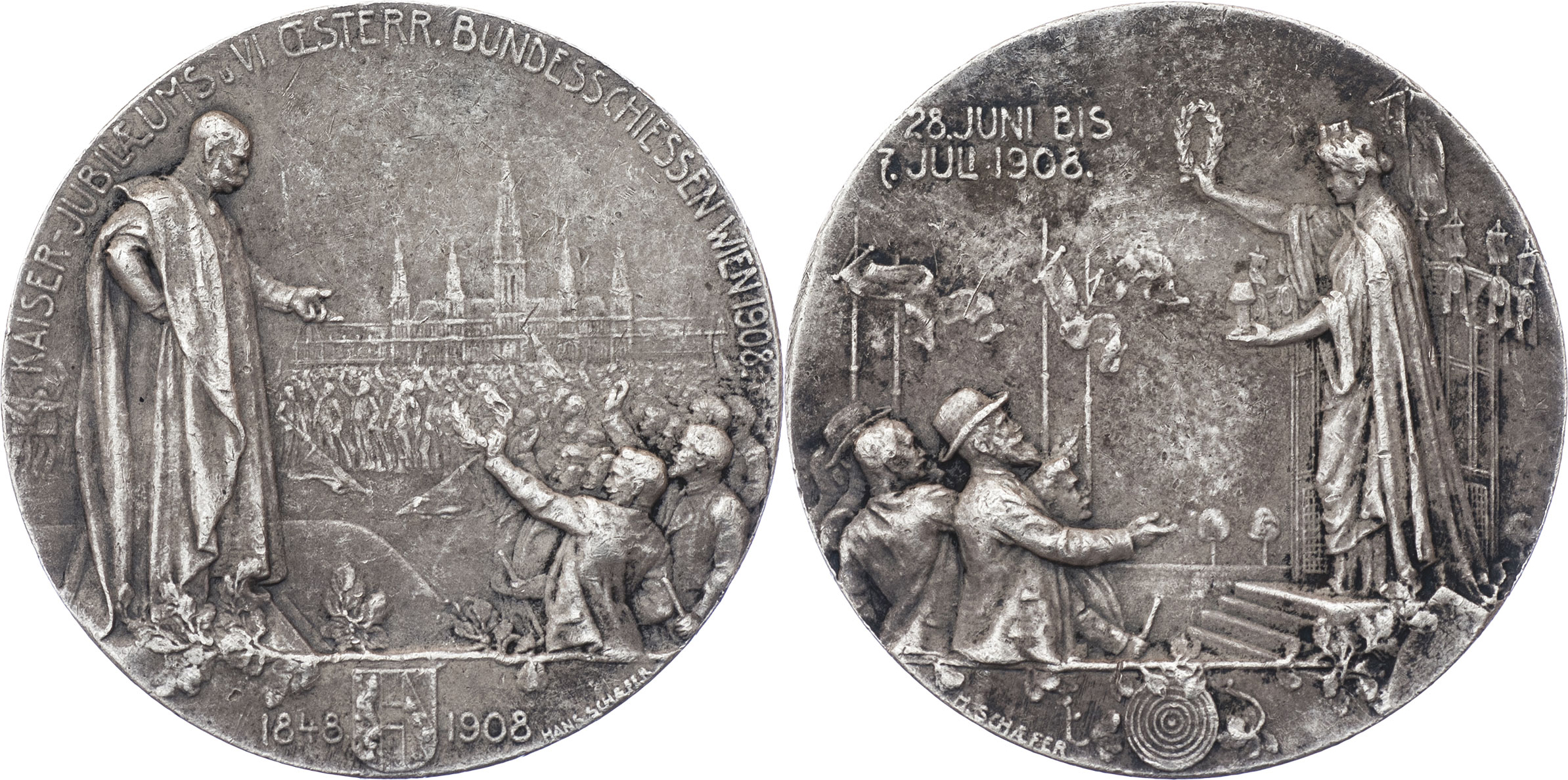 Schafer - jubilejní 6.spolkové střelby ve Vídni 1908 - císař zdraví davy, Vídeň, opis/ Vindobona, střelci, nápis, Sign., Punc., Ag, 38mm, 27.138g, nep.rys.,pat.