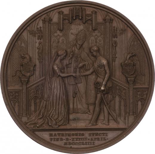 Lange - AE medaile na svatbu ve Vídni 24.4.1854 - dvojportrét zprava, opis / svatební scéna, nápis, Sign., 55mm, 84.327g, M.2675(AR), H.3764(AR), patina