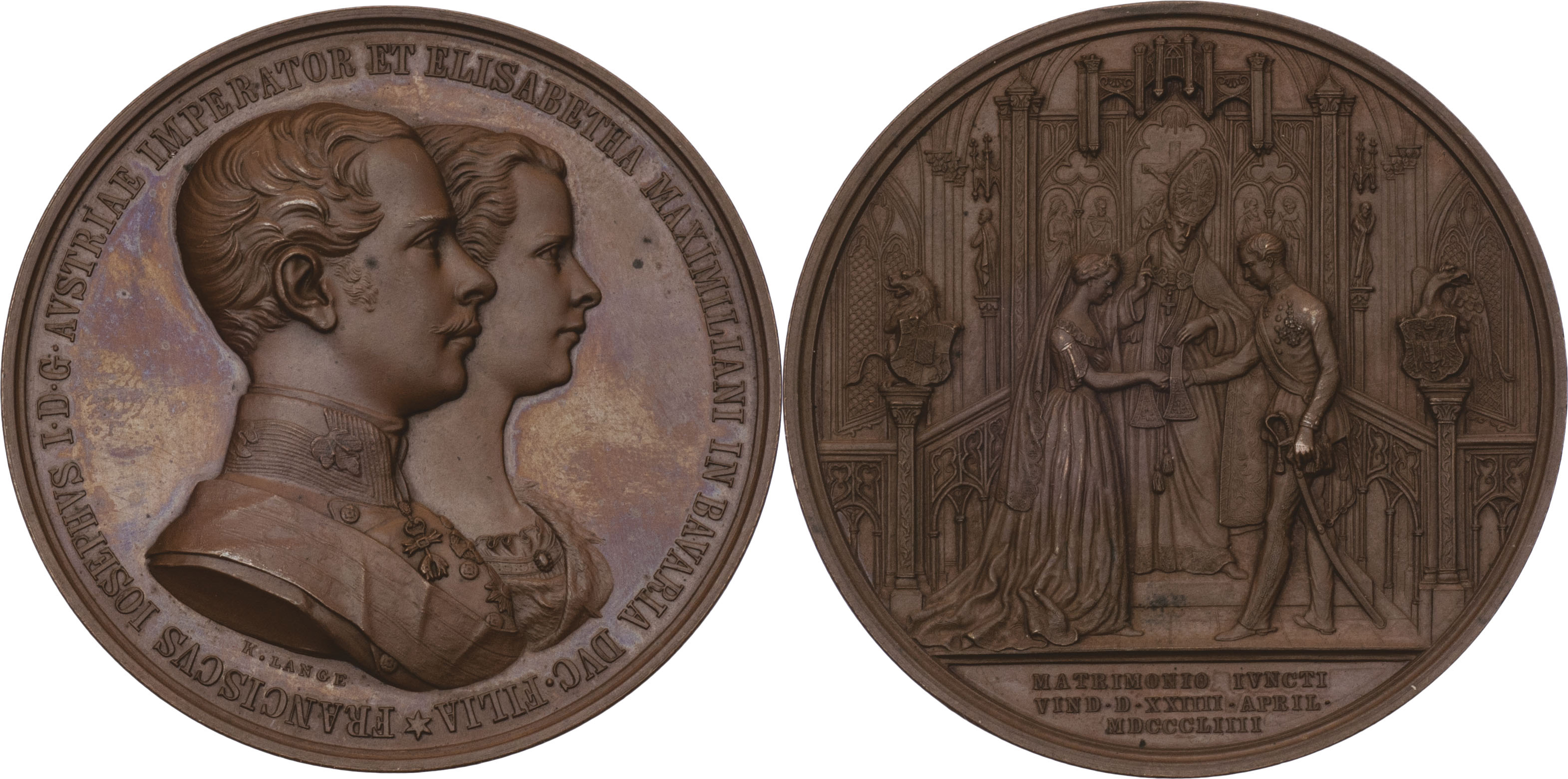 Lange - AE medaile na svatbu ve Vídni 24.4.1854 - dvojportrét zprava, opis / svatební scéna, nápis, Sign., 55mm, 84.327g, M.2675(AR), H.3764(AR), patina