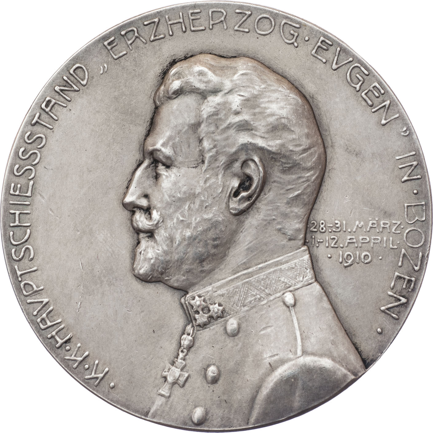 Bozen (Bolzáno) 1910 - střelby k 80.narozeninám - poprsí císaře zleva, dva opisy / poprsí arciv. zleva, opis, Nesign., patinované Ag, 45mm, 39.840g, nep.rys.