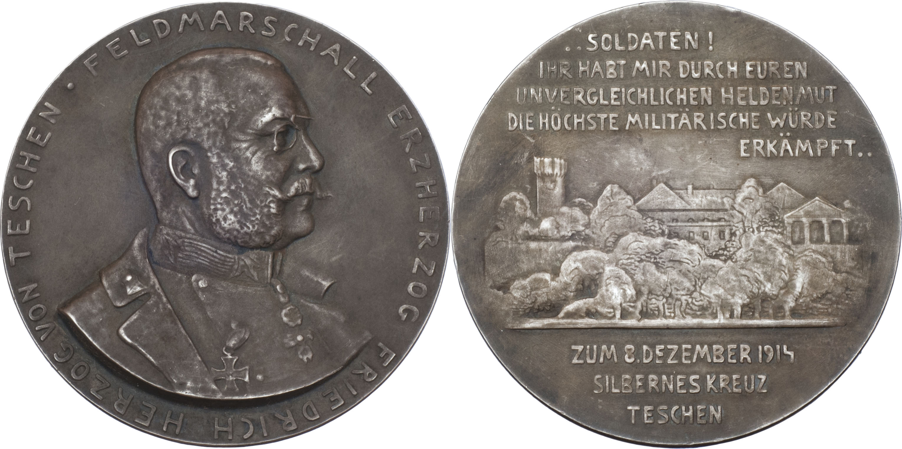 Helene Scholz - AR pam. medaile 1914 - poprsí zprava, opis / těšínský zámek s parkem, 8-řádk.nápis, Sign., Punc., Ag 55mm, 71.126g, dr.hr., nep.rys., patina R!