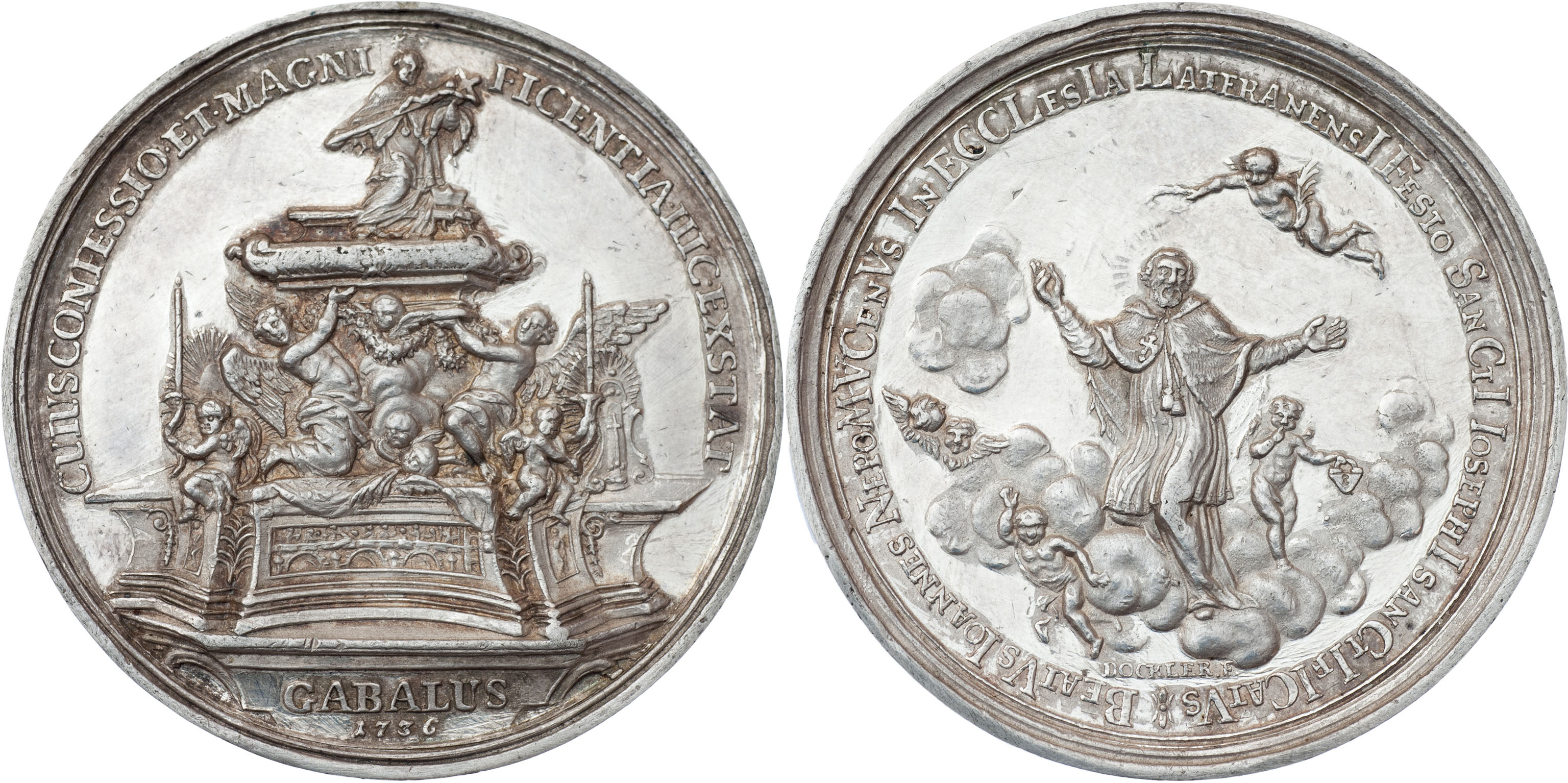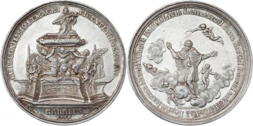 Sv. Jan Nepomucký mezi anděli v oblacích, opis/ náhrobek sv. Jana, opis a nápis, 1736, Sign.Dockler, Ag 48mm, 41.121g, Přib.566, hlazena v ploše RR!