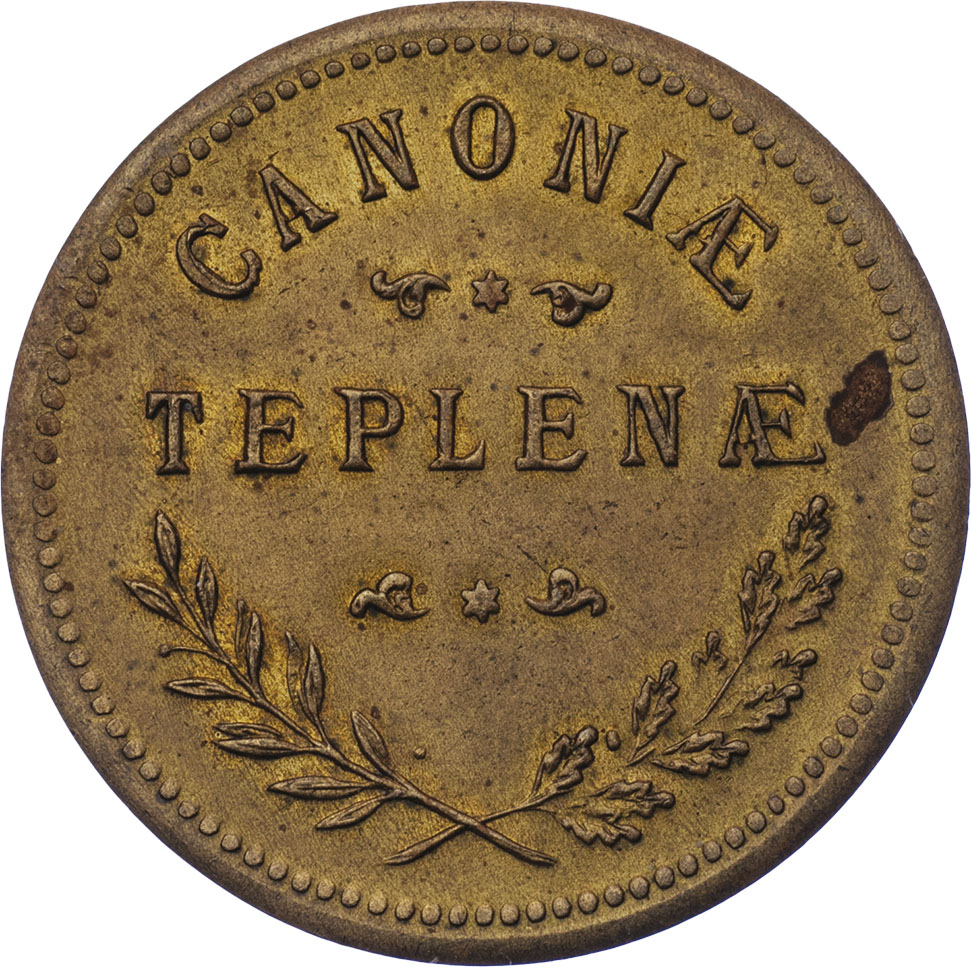 Účelová známka b.l., Sign.Pichl-Praga, Znak v kartuši zdobené mitrou a berlou / 3-řádkový nápis a věnec, mosaz 31 mm, 7.932g, just., skvrnka, patina R!