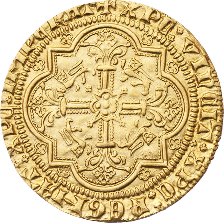 Lion d-or b.l. - novoražba, lev v kružbě, opis / velký liliový kříž v kružbě, opis, Punc., Au986, 23mm, 6.125g