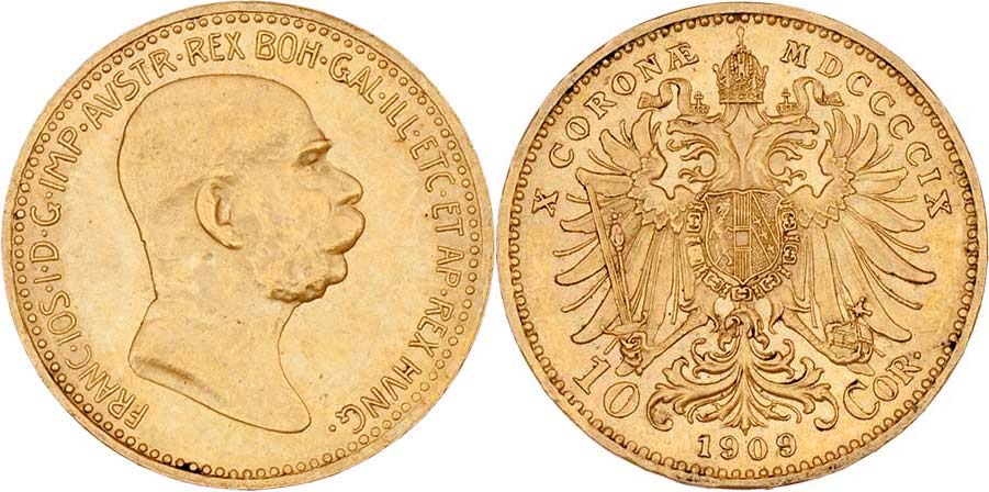 10 Koruna 1909 - Marschall, 3.384g, nep.hr., téměř