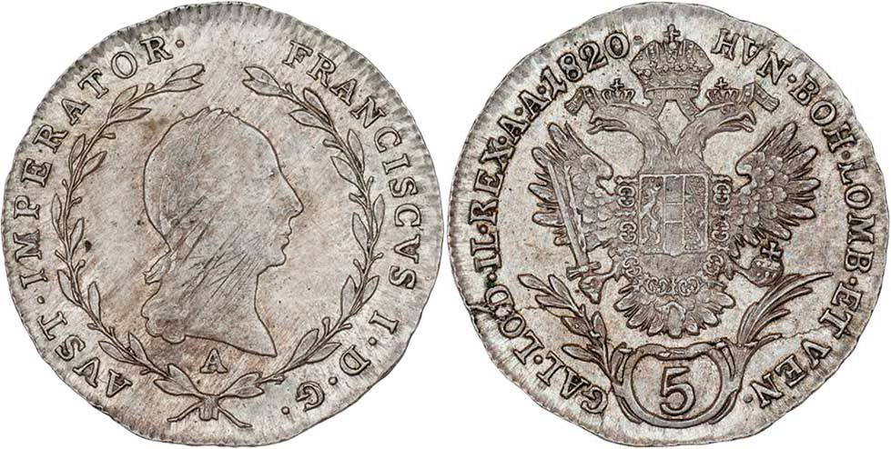 5 Krejcar 1820 A, 2.252g, dr.vady razidla, mírně just., pěkná patina