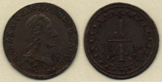 Cu 1/4 Krejcar 1812B - grafitti TL (Tezner Ladislav), 1.240g, 1.241g, pěkná patina
