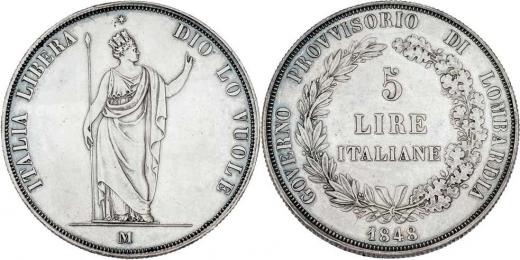 5 Lira 1848 M, Cr.22, 24.985g, nep.hr., vl.rysky, patina, téměř R!