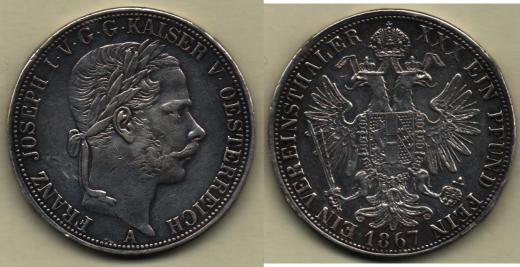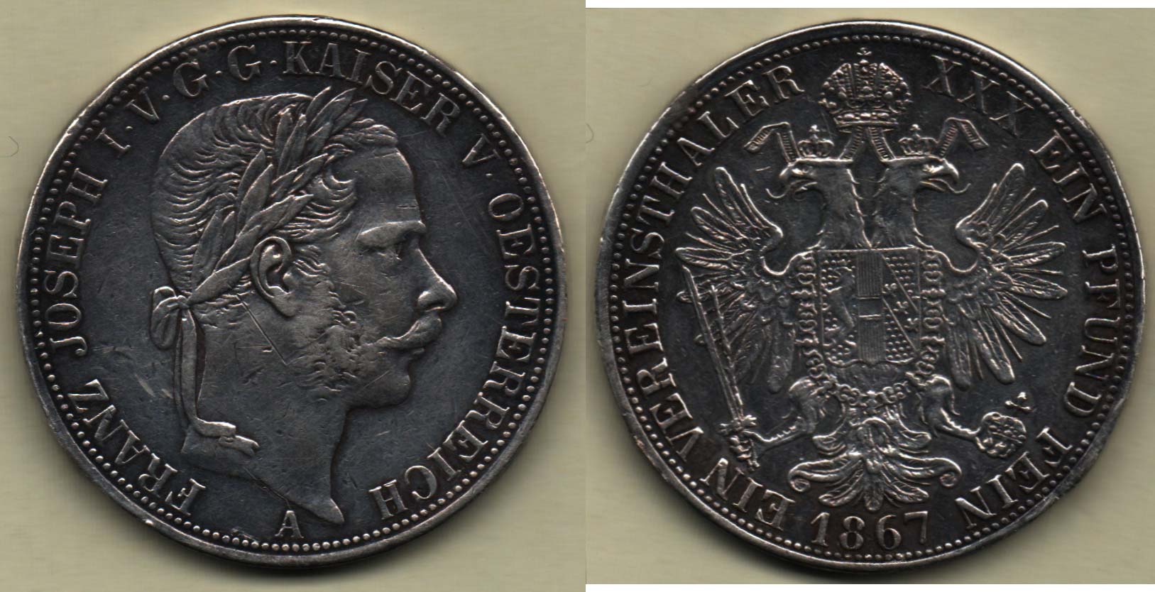 Tolar spolkový 1867 A, 18.436g, stopa po oušku, dr.hr., dr.rysky, patina