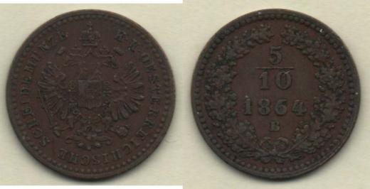 5/10 Krejcaru 1864 B, 1.581g, pěkná patina R!